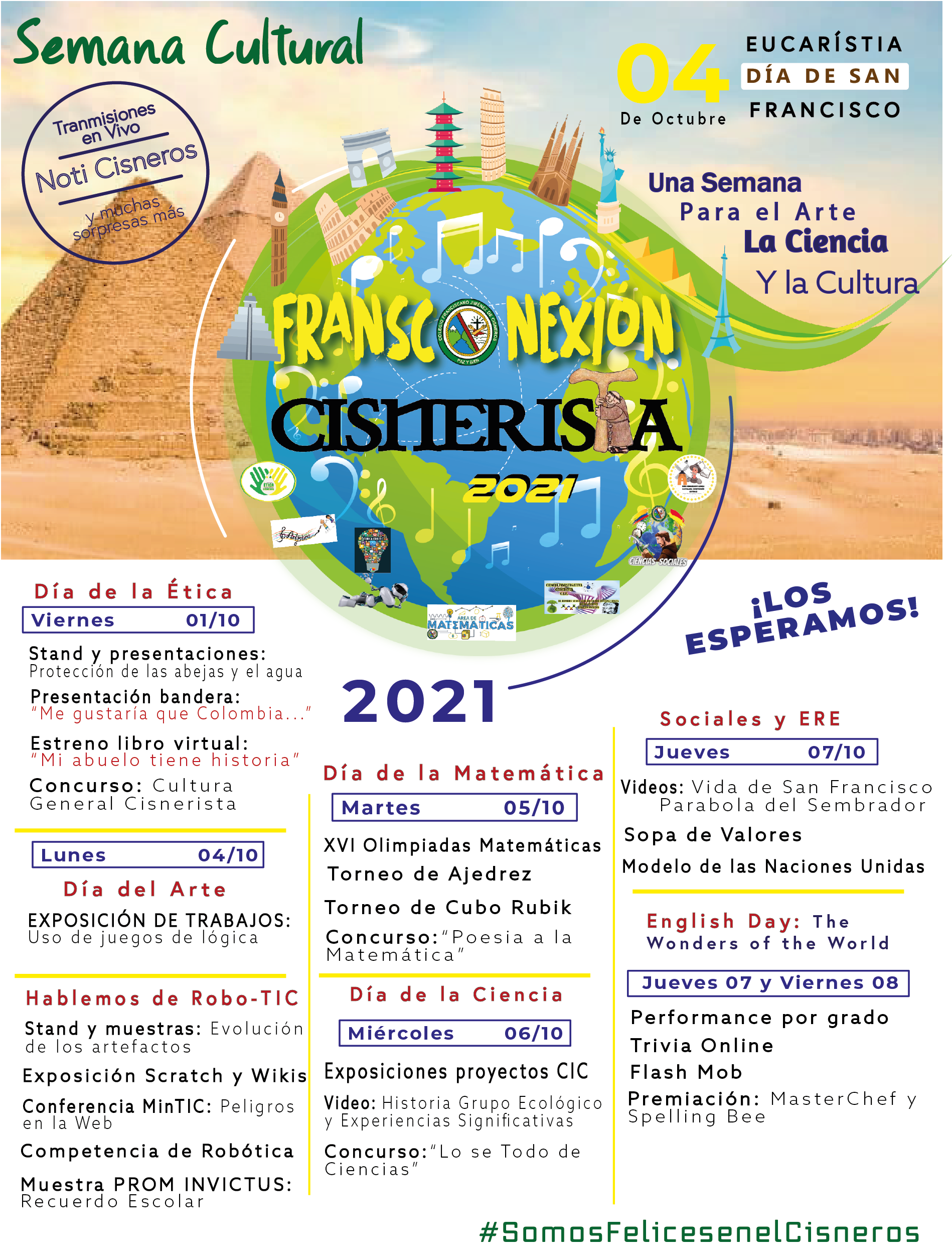 A partir de hoy 01 de octubre y hasta el próximo viernes 08, tendrá lugar nuestra Semana Cultural 2021, que para esta versión lleva el nombre de Fransconexión Cisnerista, "Una Semana para el arte, la ciencia y cultura", un escenario creado para que nuestra comunidad educativa puedan crecer tanto académica como espiritualmente, y se permita profundizar en ciertos temas y dinámicas tratadas en el entorno escolar.